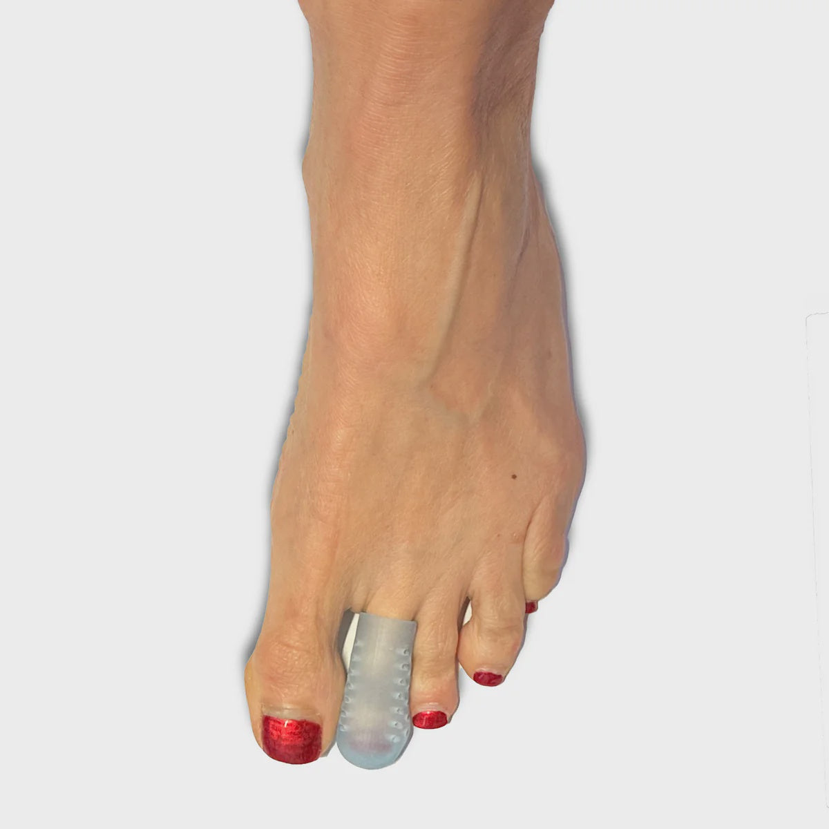 A breathable gel toe cap designed to cushion and protect the tips of toes and nails and keep your toes cool.